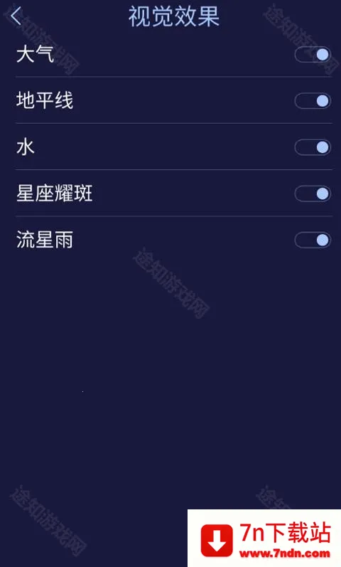 4、点击屏幕右下角菜单标签,选择“设置”,然后转到“视觉效果”,您将看到Star Walk 2中所有可用的视觉效果。还可以修改夜间模式,位置等功能;