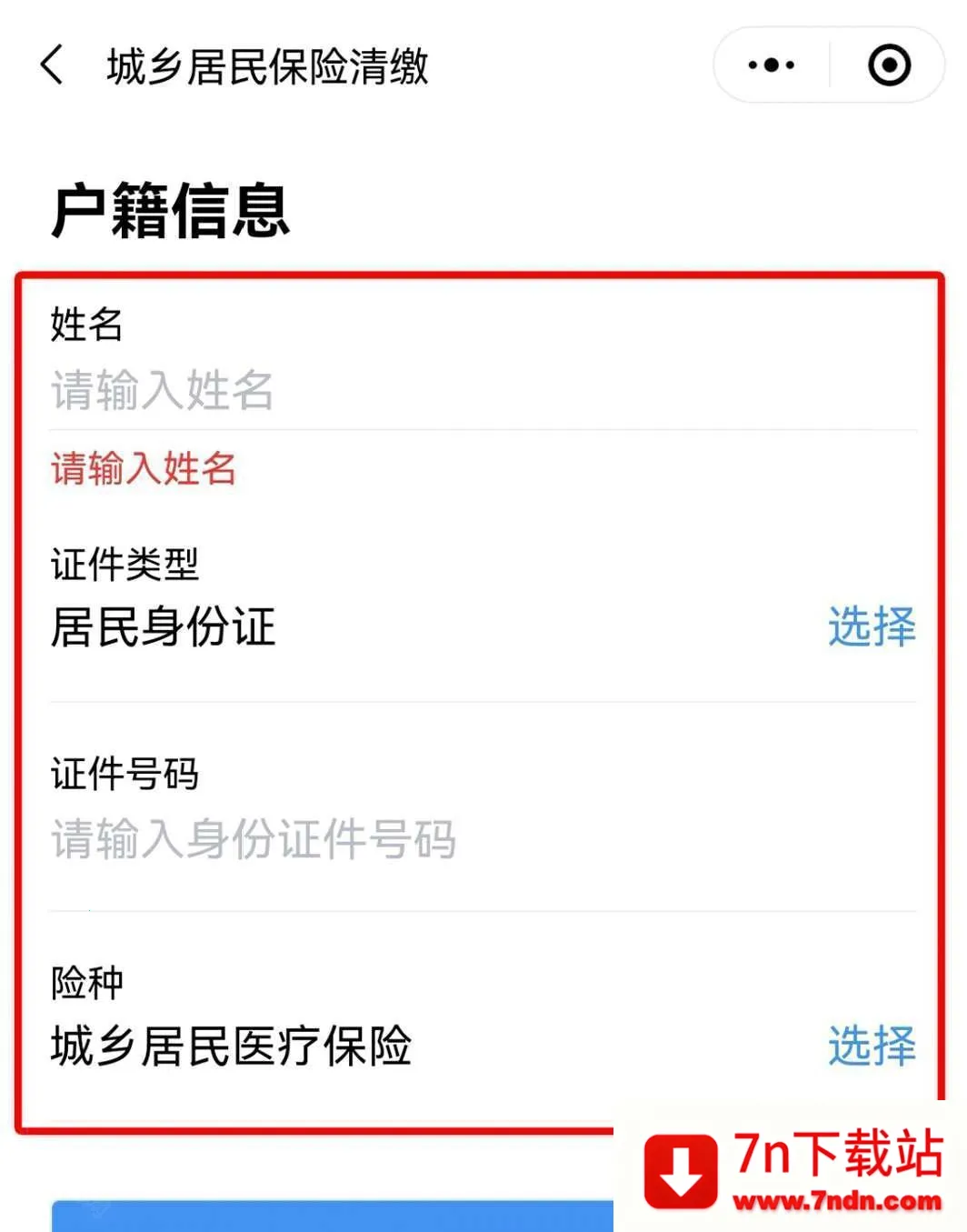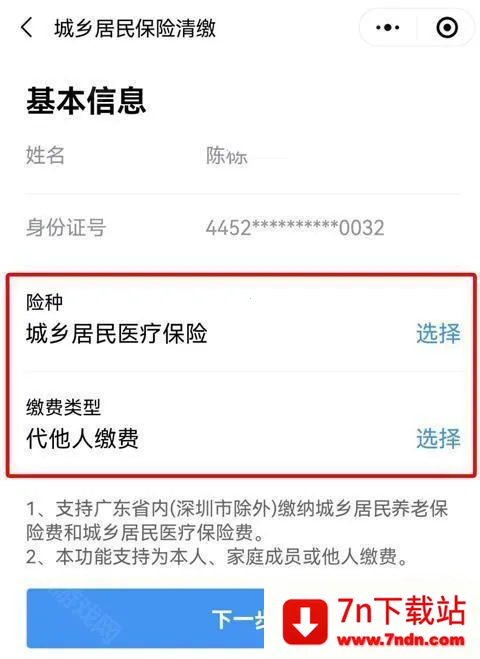 5、代他人缴费“险种”选择 “城乡居民医疗保险”,“缴费类型”选择“代他人缴费”,点击“下一步”进入“户籍信息”录入界面;