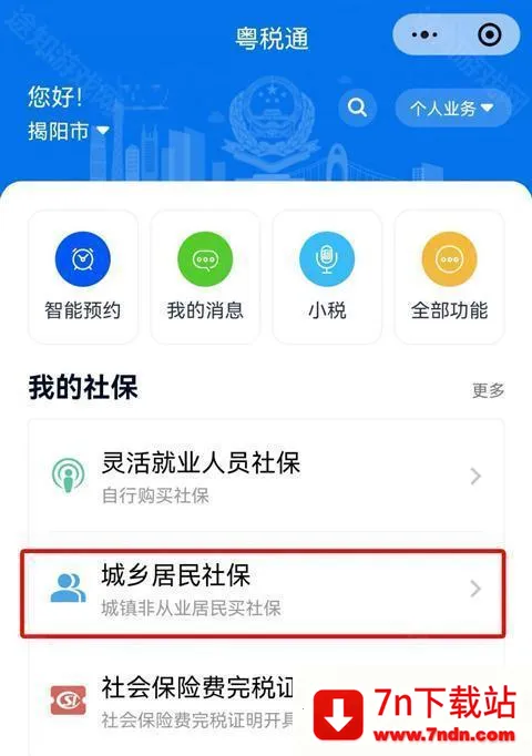 1、用户打开粤税通后,进入页面中点击【城乡居民社保】
