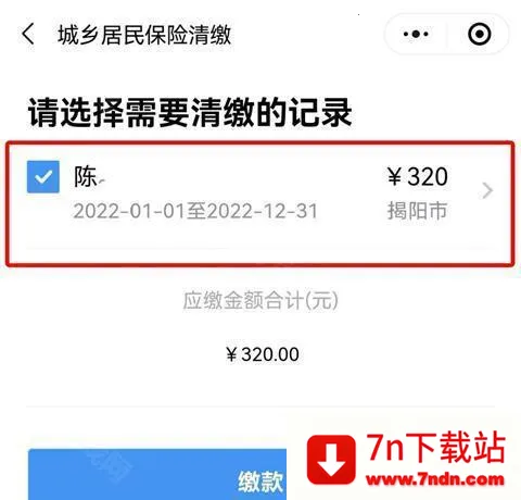 6、接着选择应征信息(原则上一个人只有一条应征数据,如果同一个人本年度出现两笔及以上应征数据,请先与各地医保经办机构核对修正,避免错误缴费),点击“缴款”进入“温馨提示”界面,请详细阅读提示内容
