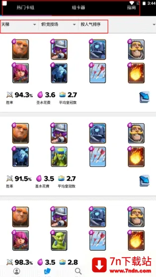 卡组主要分为热门卡组、组卡器和指南这三大块,热门卡组从天梯、竞技场等级以及人气这三个元素来筛选;组卡器就是通过你的卡牌来进行收藏;指南就是包含卡组的玩法攻略。
