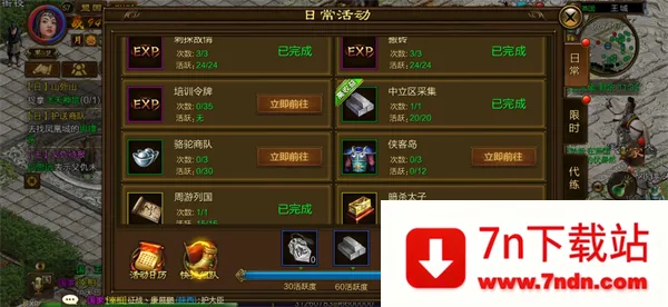 日常活动中有各种日常任务,中立区采集可以获得硬皮、秘银,周游列国奖励藏宝图有几率挖到硬皮、秘银,暗杀太子则可获得魂魄石,BOSS猎杀可获得秘银、硬皮、升级宝石。日常任务奖励的宝箱开启也有概率获得硬皮、秘银、魂魄石。完成日常任务会增加活跃度,达到一定活跃度即可领取秘银、硬皮、魂魄石、升级宝石奖励,日常任务每天一定要完成。
