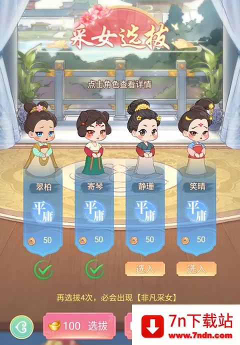 1、玩家点击右下角的选拔即可进行采女的选拔,选择合适的采女加入宫中进行工作。