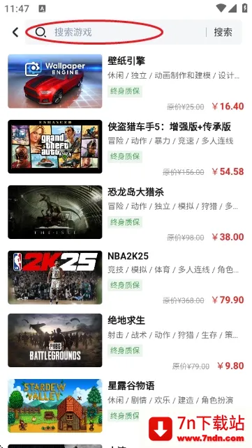2、点击顶部搜索框,输入您想查找的游戏名称,快速精准定位目标游戏。