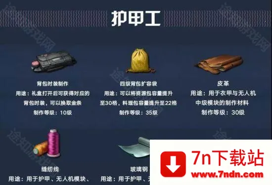 背包时装制作、皮革制作术、4级背包扩容袋、缝纫线制作术、护甲福至心灵、无机硅胶。