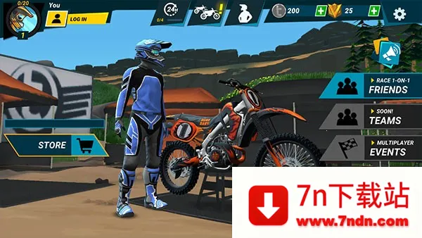 1、打开疯狂特技摩托车3新版,进入大厅页面,左侧的“store”是商店,上方分别是摩托车型号和车手,左上角是个人中心,进入可以查看详情和战绩。