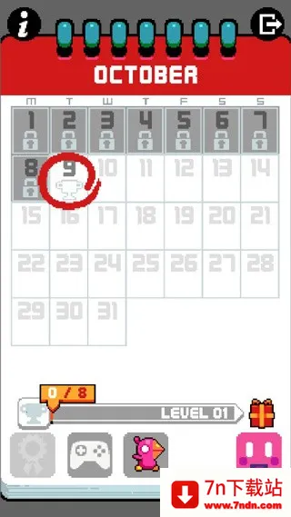 也许你要说,一个无穷无尽的跳跃游戏,要存档点有啥用呢,实际上每一关游戏都有一个高度作为奖杯点的,当玩家达到这个高度的时,就可以在当天的日历上获得奖杯标记,所以如果不是为了冲击高度的话,其实每天玩家的任务很简单,只要达到了一定的高度,拿到奖杯标记,在日历上登记一下就可以了,看起来游戏很贴心,为了不让玩家沉迷所以做了这么个奖杯设定对吧,你错了,日历设定是最让人沉迷的坑。