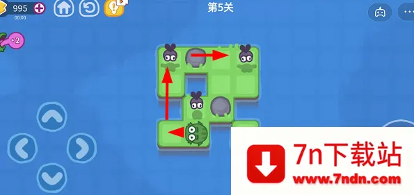 3、再从左侧绕行一圈到达指定位置,即可吃掉最下方一行左右两侧的蚊子。