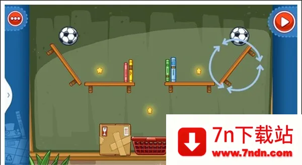 我们只需要将两个木板凳放在斜放在两侧,气球放在足球下面,这样使气球飞上去,碰到足球这样就能获得星星。