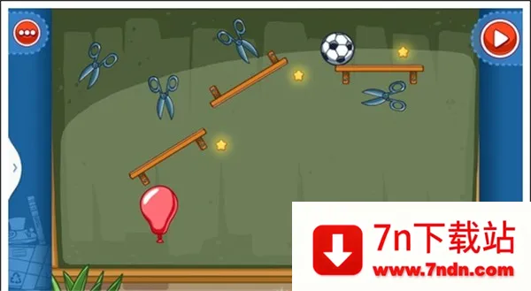 我们只需要将三个木板凳放在剪刀下面,否则气球会碰到剪刀和破掉,这样使气球飞上去,就能获得星星。