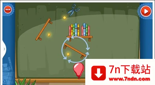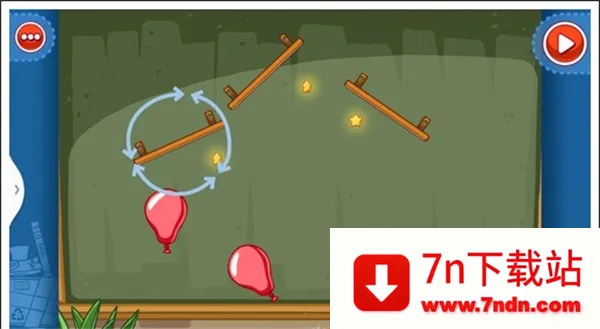 我们只需要将三个木板凳各自斜放在星星上头就可以让气球自由飞上去,获得星星。
