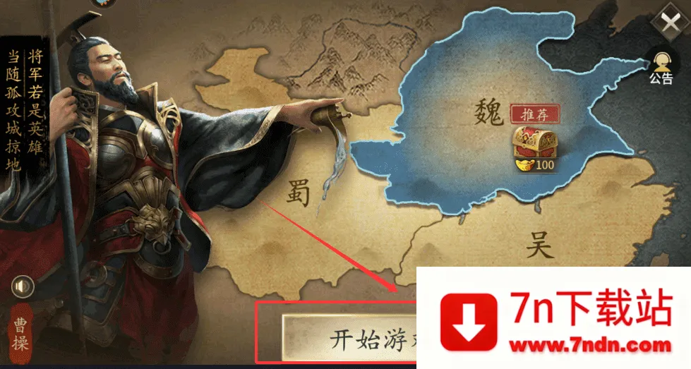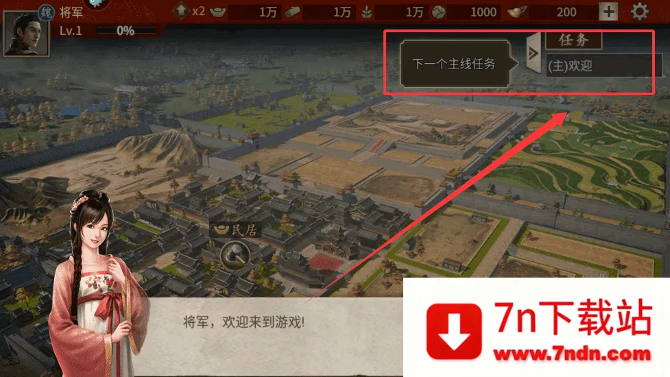 1、比如选择曹操势力,再点击开始游戏按钮就能正式进入。接着你会看到主城界面,注意左上角的将军等级和资源数量,像木材、粮草这些都要留意收集。